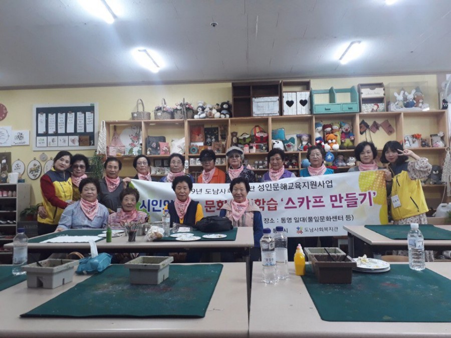 9월 27일(금) 도남사회복지관 한글교실 어르신 12분과 함께 문화체험학습을 다녀왔습니다! 죽림에 위치한 풀잎문화센터에서 스카프 만들기 체험도 하고, 맛있는 추어탕도 먹고 즐거운 추억을 쌓을 수 있었습니다! 어르신들께서는 자신 없어 하시다가도 막상 스카프 만들기를 시작하니 훌륭한 미술솜씨를 뽐내기도 하셨습니다. 직접 만든 스카프를 두르고 단체 사진을 한 컷 찍기도 하였답니다! 부족한 부분이 많았지만 높은 만족감을 나타내신 어르신들과 이무숙 선생님께도 다시 한 번 감사의 인사를 드립니다^^