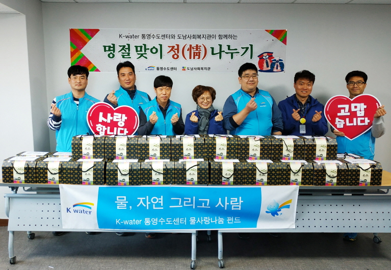 통영수도센터(센터장 한주헌)는 수년째 지속적으로 도남사회복지관을 방문하여 명절맞이정나누기 사업에 함께 동참하고 있으며, 상호협력적인 관계로 사회공헌활동을 진행하고 있다.