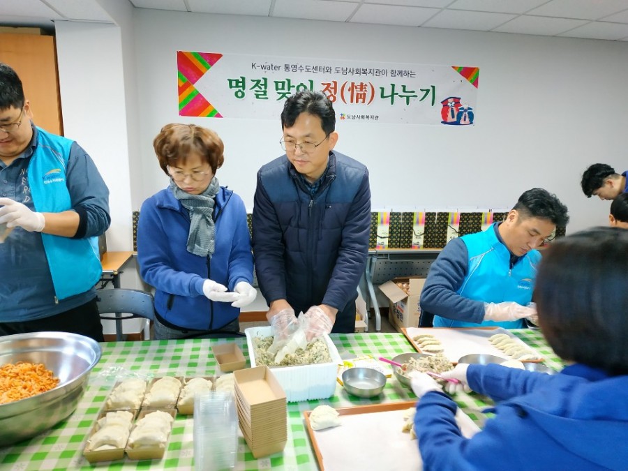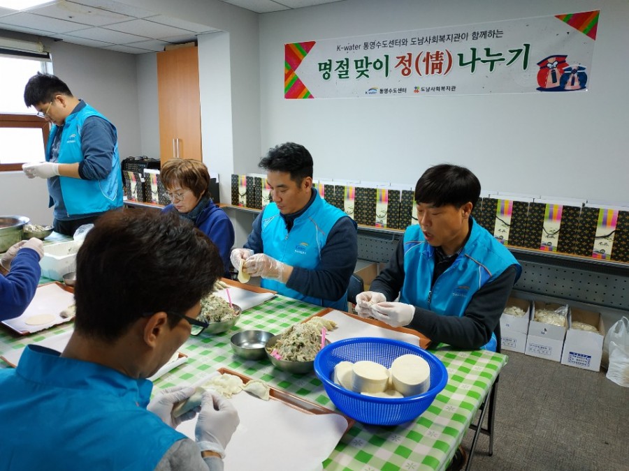 명절을 맞이하여 통영수도센터에서는 사회공헌사업의 일환으로 도남사회복지관(관장 배은영)에 후원금을 전달하고 명절음식을 만드는 자원봉사자로 참여하여 만두빚기와 다양한 명절선물을 준비하여 명절분위기 속 소외 받기 쉬운 주위 이웃들에게 정성가득 한 명절음식을 전달할 수 있었다.