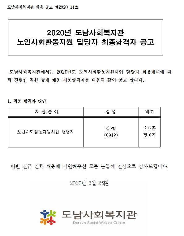 (채용공고 2020-14호) 도남사회복지관 노인사회활동지원사업 담당자 최종합격자 공고