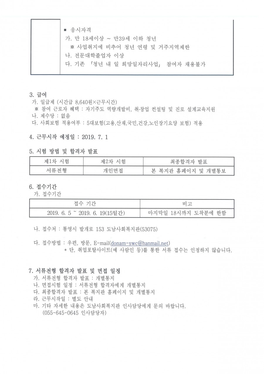 도남사회복지관 청년 내 일 희망일자리 참여근로자 채용공고