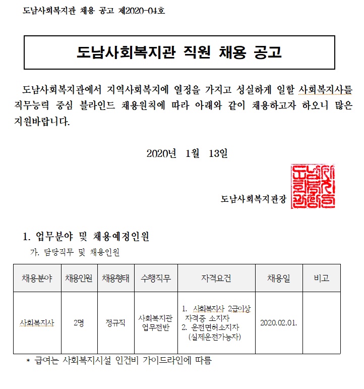 (채용공고2020-04호) 도남사회복지관 직원(정규직) 채용공고