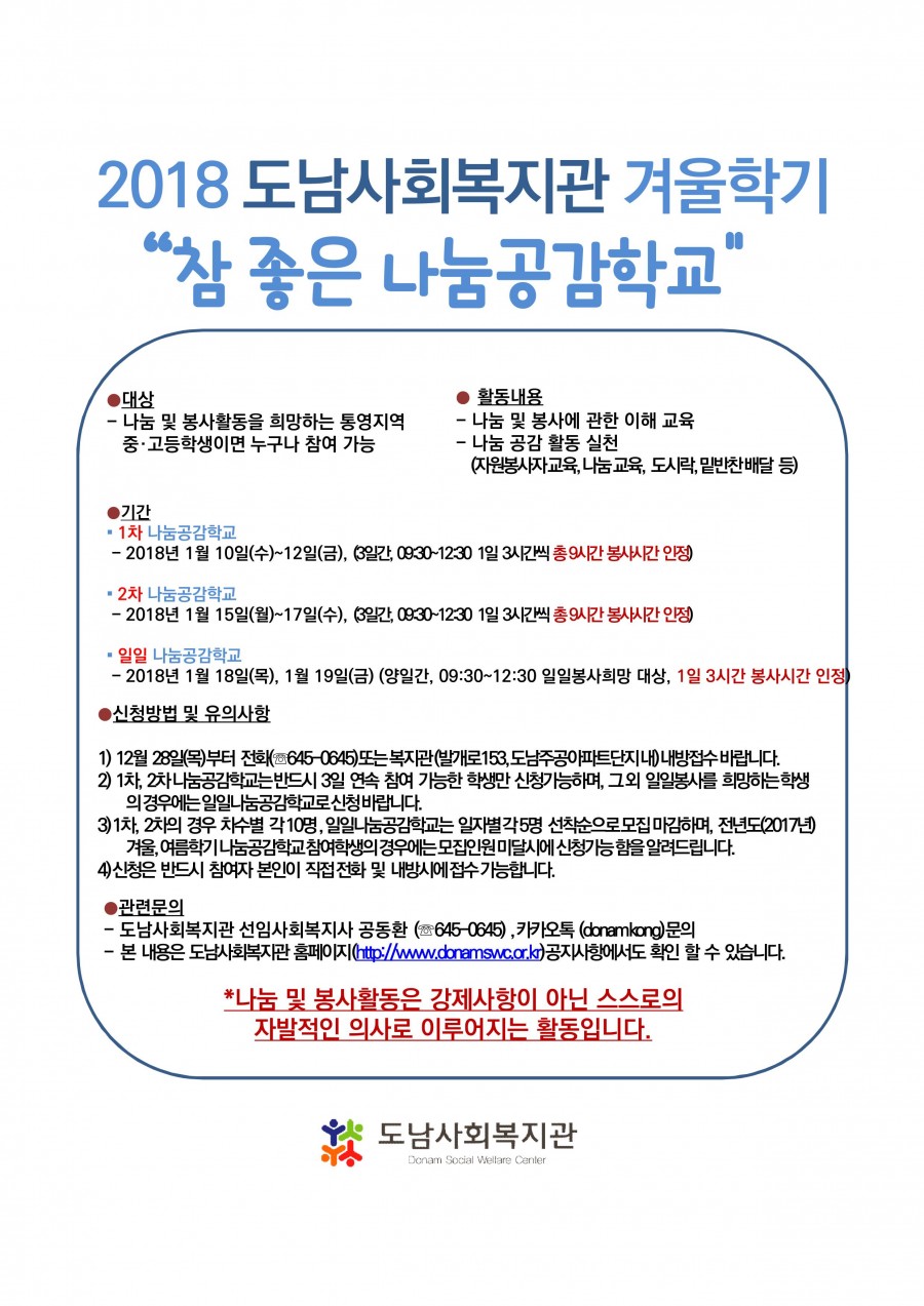 2018년 겨울학기 청소년나눔공감학교 안내(신청마감)