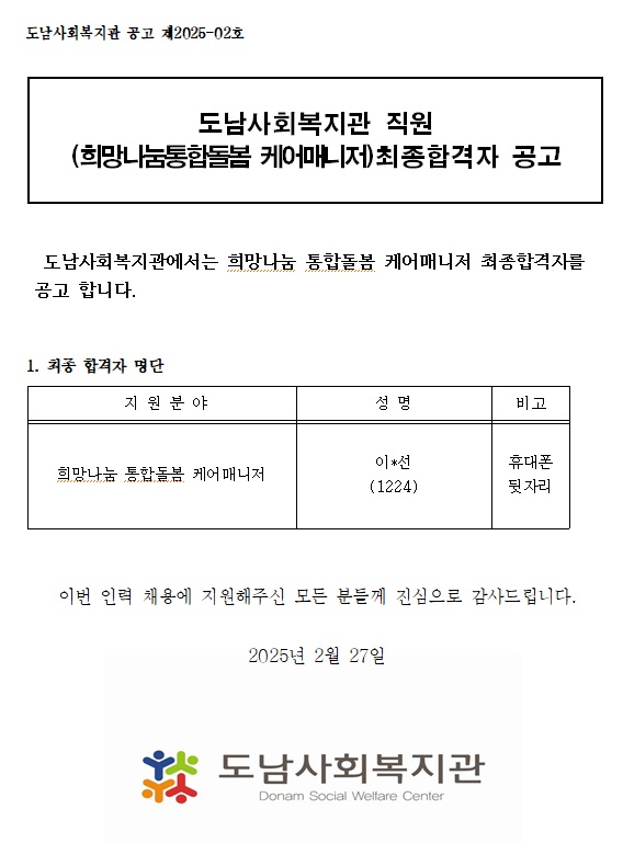 (공고 2025-02호) 2025 희망나눔 통합돌봄(케어매니저) 합격자 공고