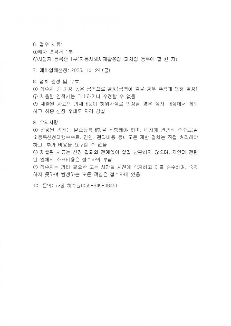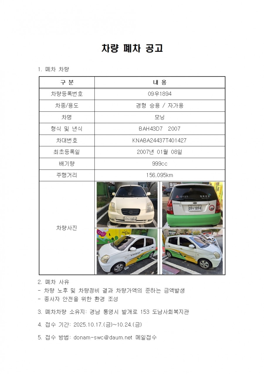 2025년 도남사회복지관 차량(모닝) 폐차 공고를 다음과 같이 진행하고자 합니다.