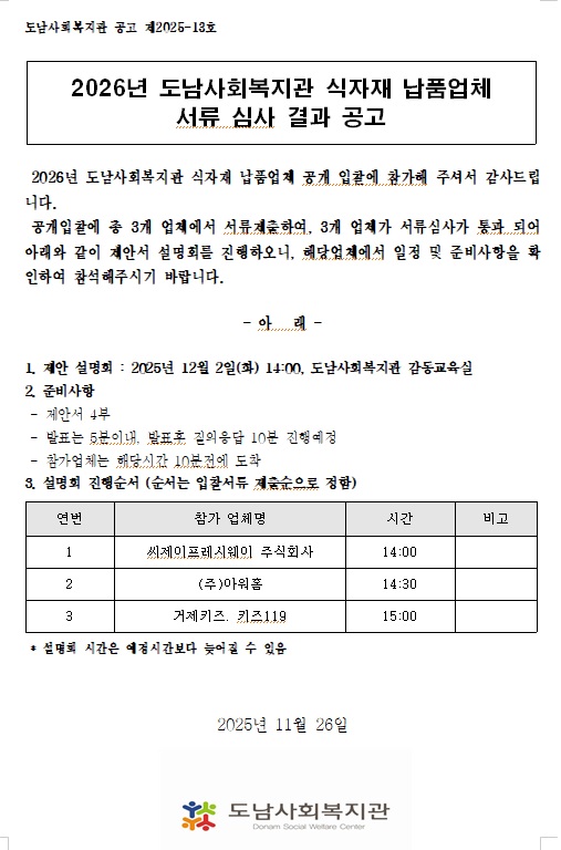 (공고2025-13호) 2026년 도남사회복지관 식자재 납품업체 서류 심사 결과 공고