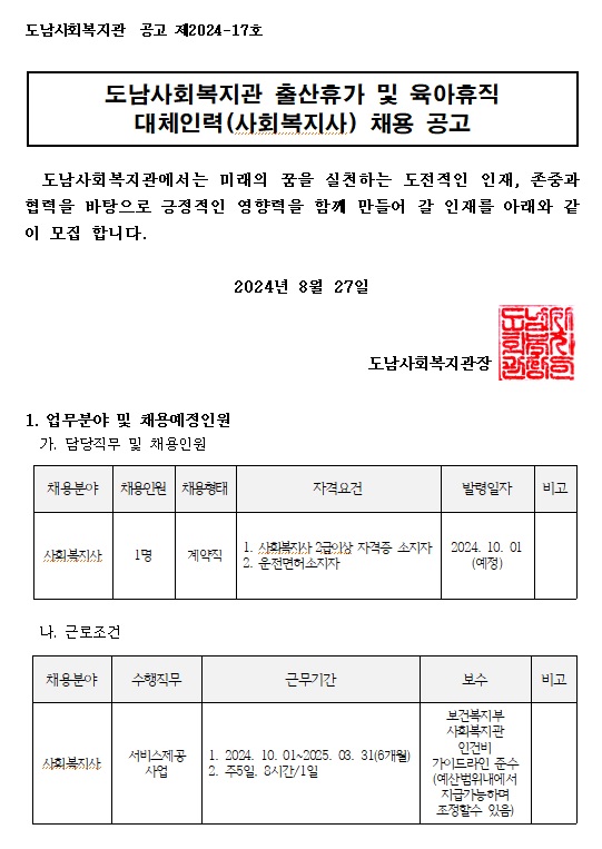 (공고2024-17호)도남사회복지관 직원(사회복지사) 출산휴가 및 육아휴직 대체인력 채용 공고