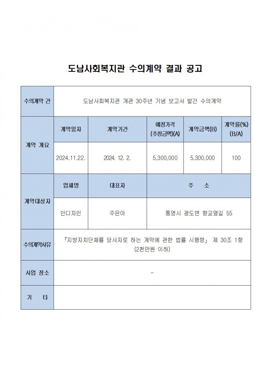 도남사회복지관 개관 30주년 기념 보고서 발간 수의계약 결과를 공고하고자 합니다.