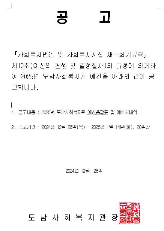 (공고2024-26호) 2025년 도남사회복지관 세입·세출 예산서 공고