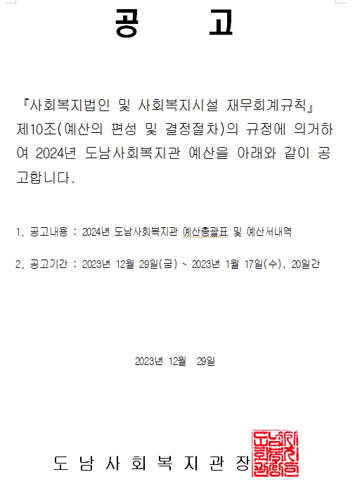 (공고2023-18호) 2024년 도남사회복지관 예산,결산 공고