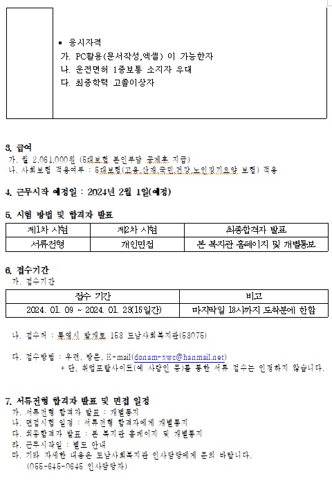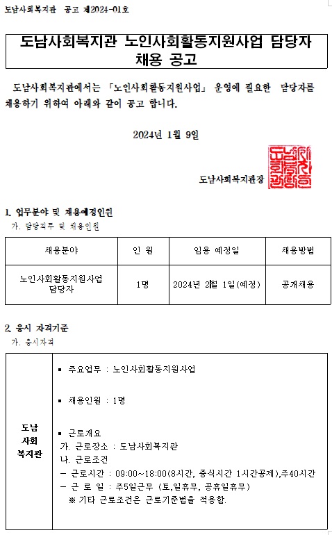 (공고2023-01호) 도남사회복지관 노인사회활동지원사업 담당자 채용공고
