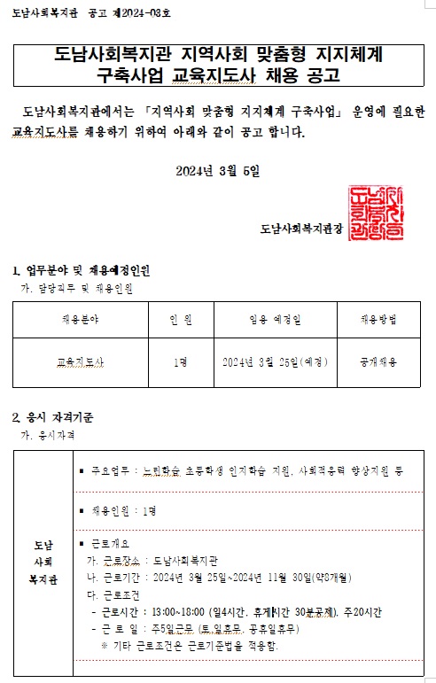 (채용공고 2024-03호) 지역사회 맞춤형 지지체계 구축사업 교육지도사 채용공고