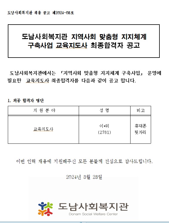 (공고2024-08호) 지역사회 맞춤형 지지체계 구축사업 교육지도사 합격자 공고