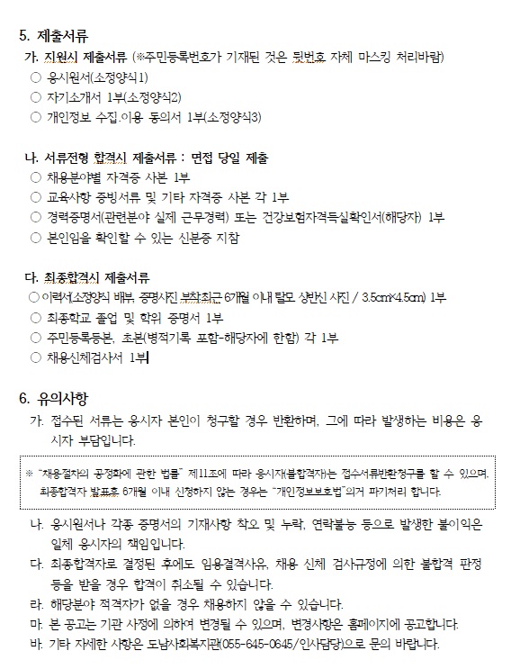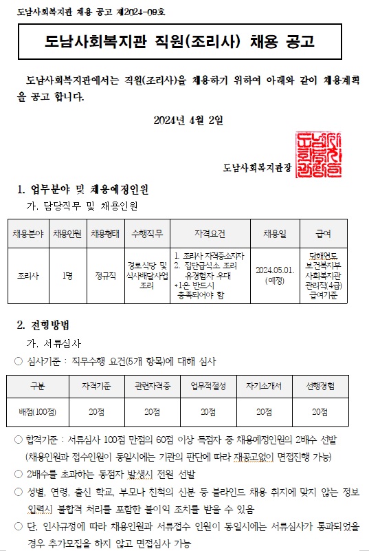 (공고 2024-09호) 도남사회복지관 조리사 채용공고