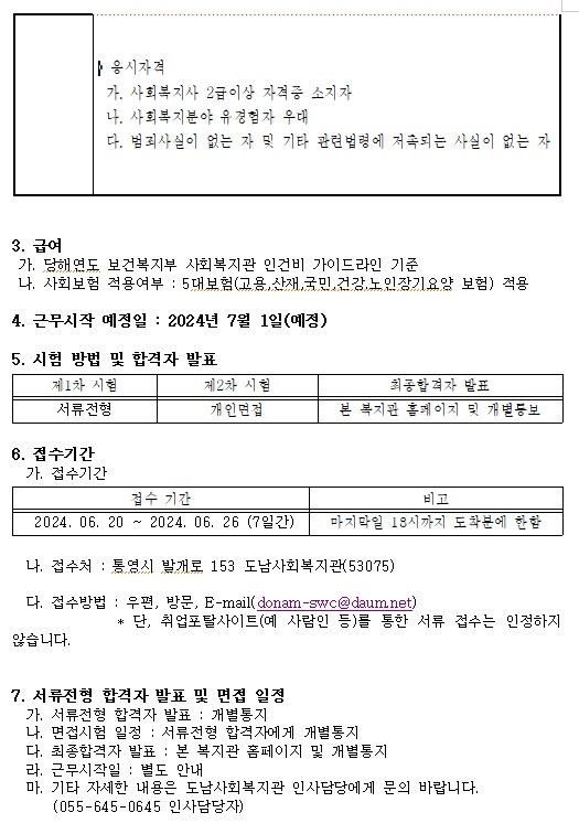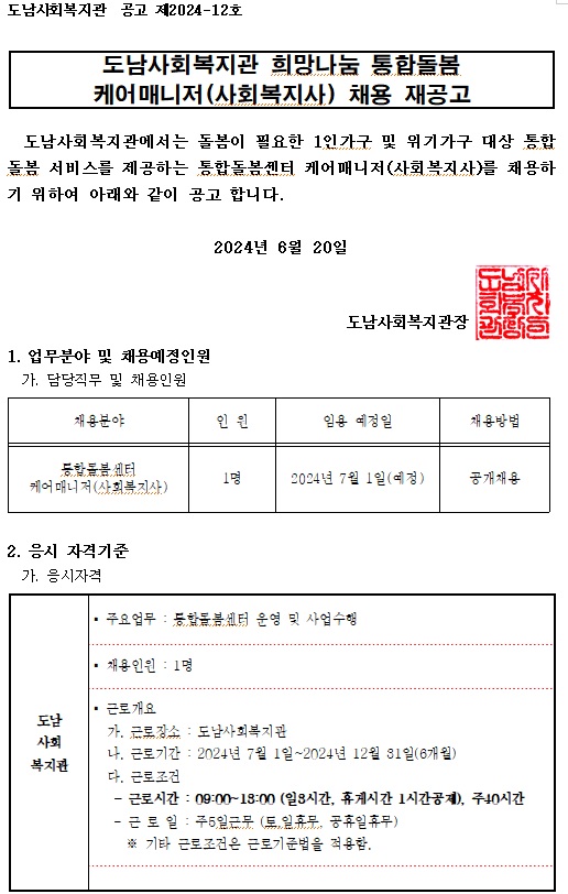 (공고2024-12) 도남사회복지관 희망나눔 통합돌봄 케어매니저(사회복지사) 채용 재공고(긴급)