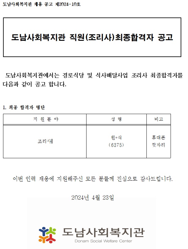 (공고 2024-14호) 도남사회복지관 조리사 합격자 공고