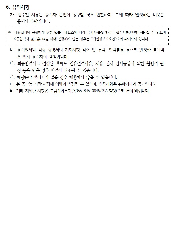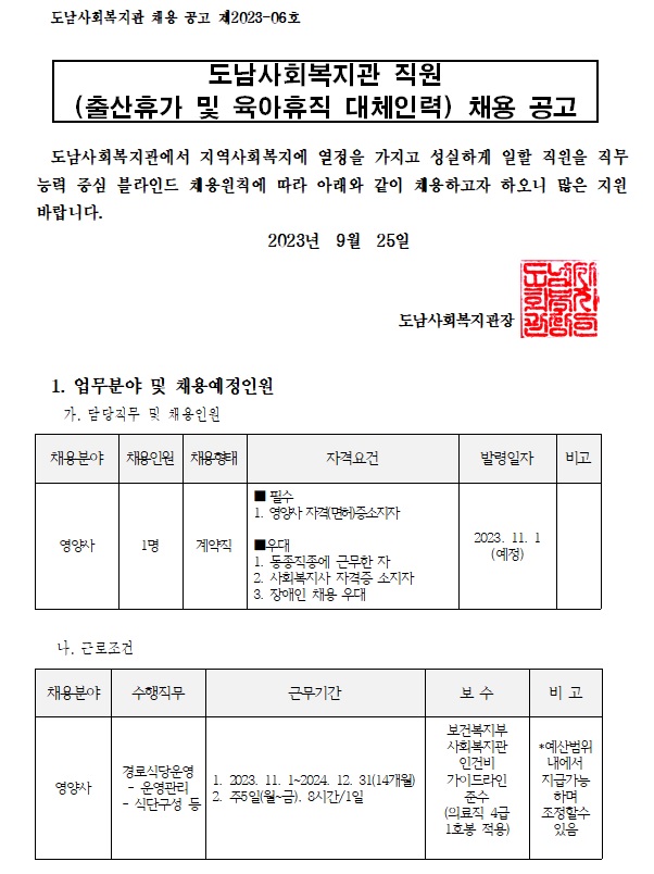 (채용공고 2023-06) 도남사회복지관 영양사 출산휴가 및 육아휴직 대체인력 채용 재공고