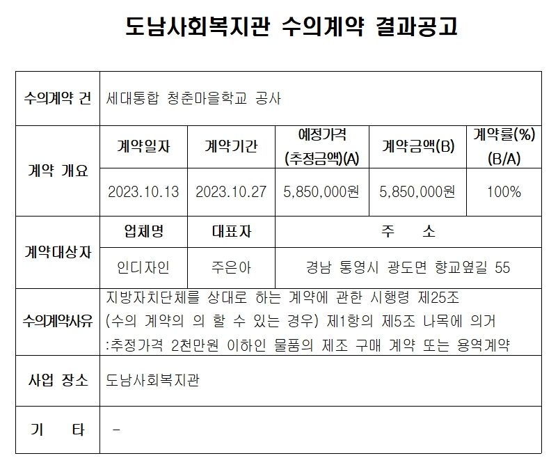 도남사회복지관 "세대통합 청춘마을학교 공사 건" 수의계약 결과를 공고하고자 합니다.