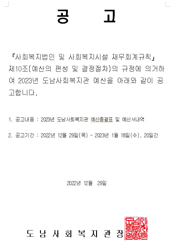2023년 도남사회복지관 세입, 세출 예산서 공고