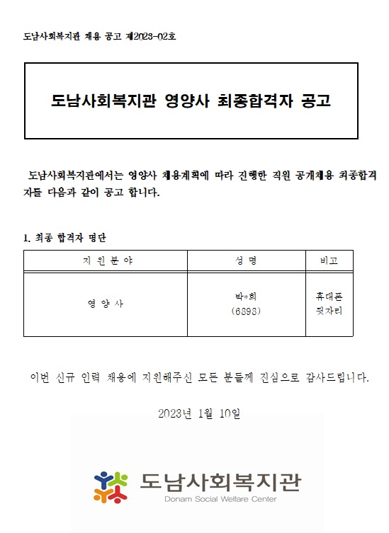 (채용공고2023-02호) 도남사회복지관 영양사 최종합격자 발표