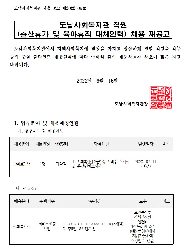 (채용공고2022-05호) 도남사회복지관 직원(출산휴가 및 육아휴직 대체인력) 채용 재공고