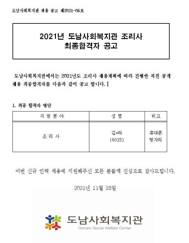 (채용공고2021-05호) 도남사회복지관 직원(조리사) 최종합격자 발표