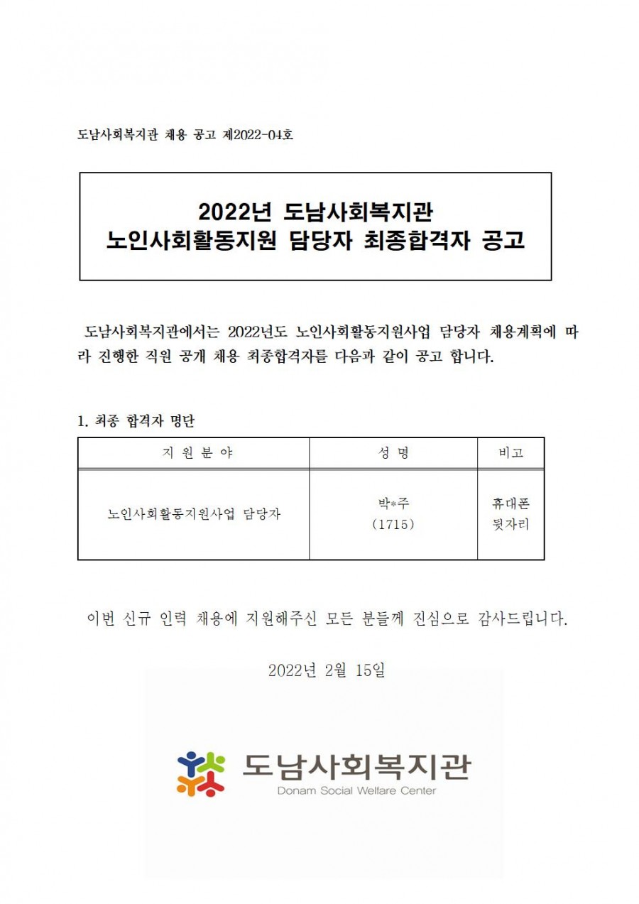 (채용공고2022-04호) 도남사회복지관 노인사회활동지원사업 담당자 최종합격자 공고