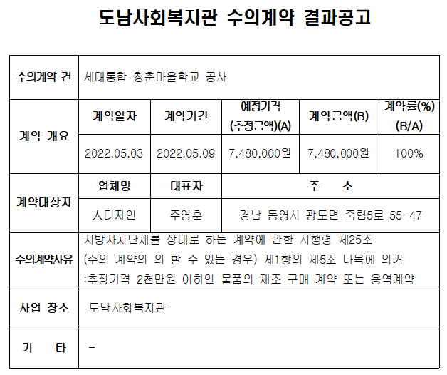 도남사회복지관 세대통합 청춘마을학교 공사 수의계약 결과를 공고하고자 합니다.