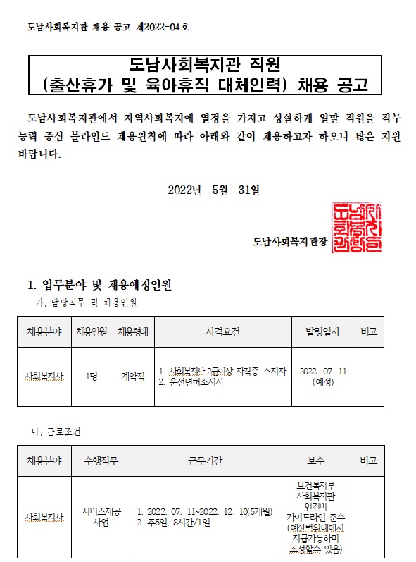 (채용공고2022-04호) 도남사회복지관 직원(출산휴가 및 육아휴직 대체인력) 채용공고