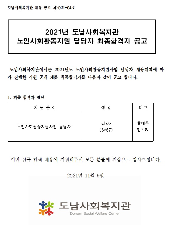 채용공고 2021-04호 노인사회활동지원사업 담당자 최종합격자 공고