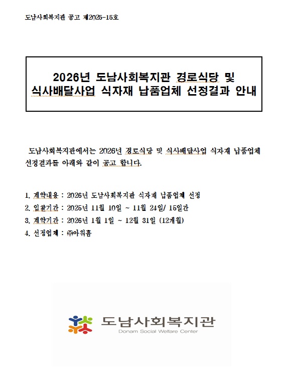 (공고2025-15호) 2026년 도남사회복지관 경로식당 및 식사배달사업 식자재 납품업체 선정결과 안내