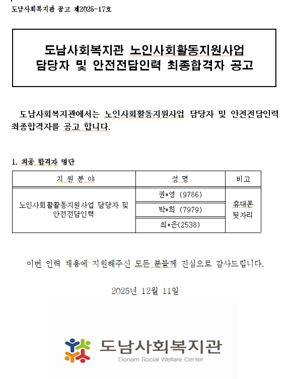 (공고2025-17호)도남사회복지관 노인사회활동지원사업 담당자 및 안전전담인력 합격자 공고