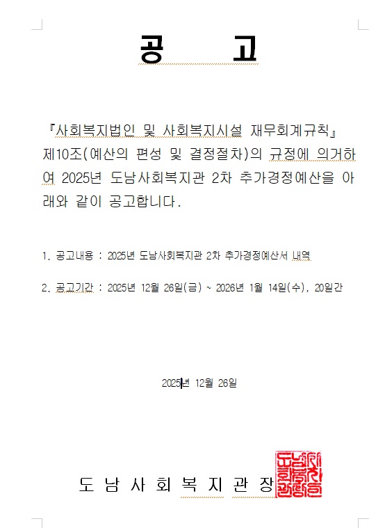 (공고2025-21호) 2025년 도남사회복지관 2차 (결산) 추가경정예산 공고
