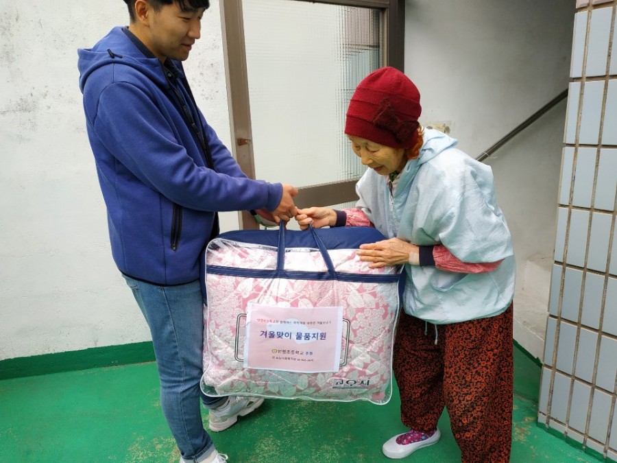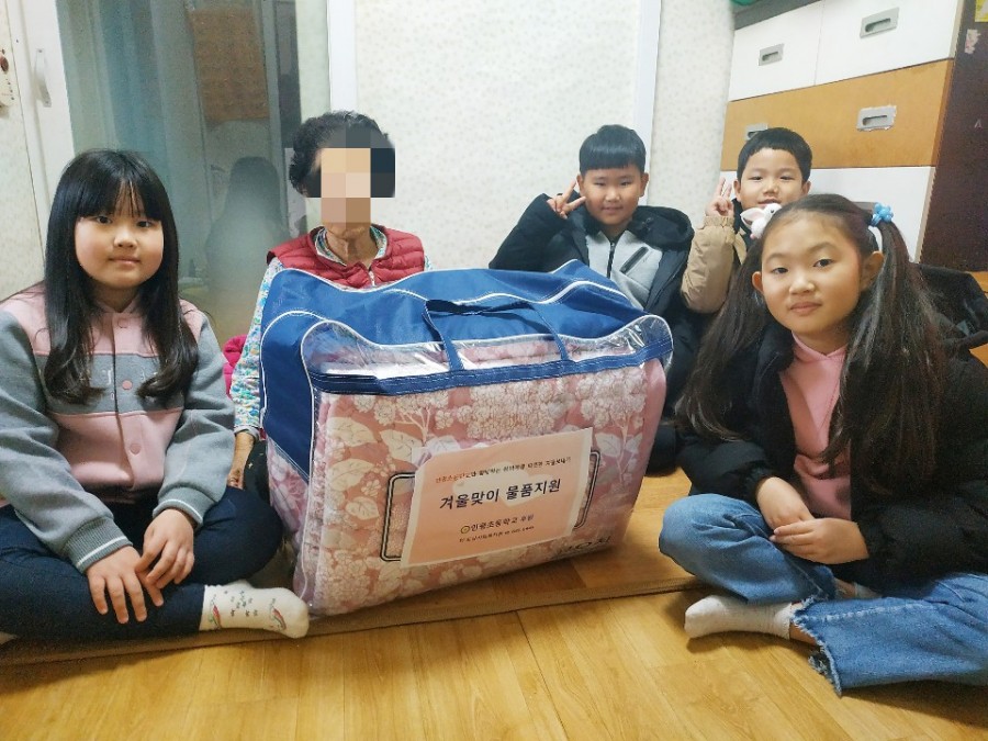 이 후원금은 지역 내 어려운 이웃들에게 겨울용품 구입에 사용되었으며, 지난 11월 27일 교사와 2,3학년 학생임원들이 직접 3세대에 겨울이불, 내의, 방한내피 등을 지원하였다.