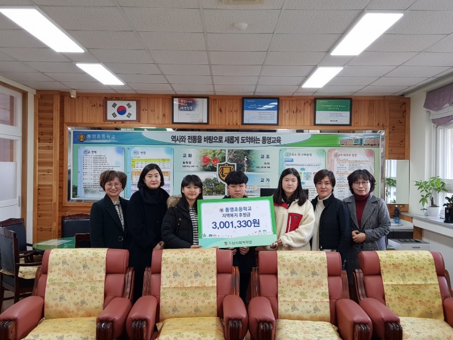 통영초등학교 재학생 및 학부모회, 학교운영위원회가 함께한 「환경사랑과 이웃사랑을 실천하는 통영 알뜰장터」에서 발생한 수익금을 지역사회복지후원금으로 도남사회복지관에 전달해주셨습니다.