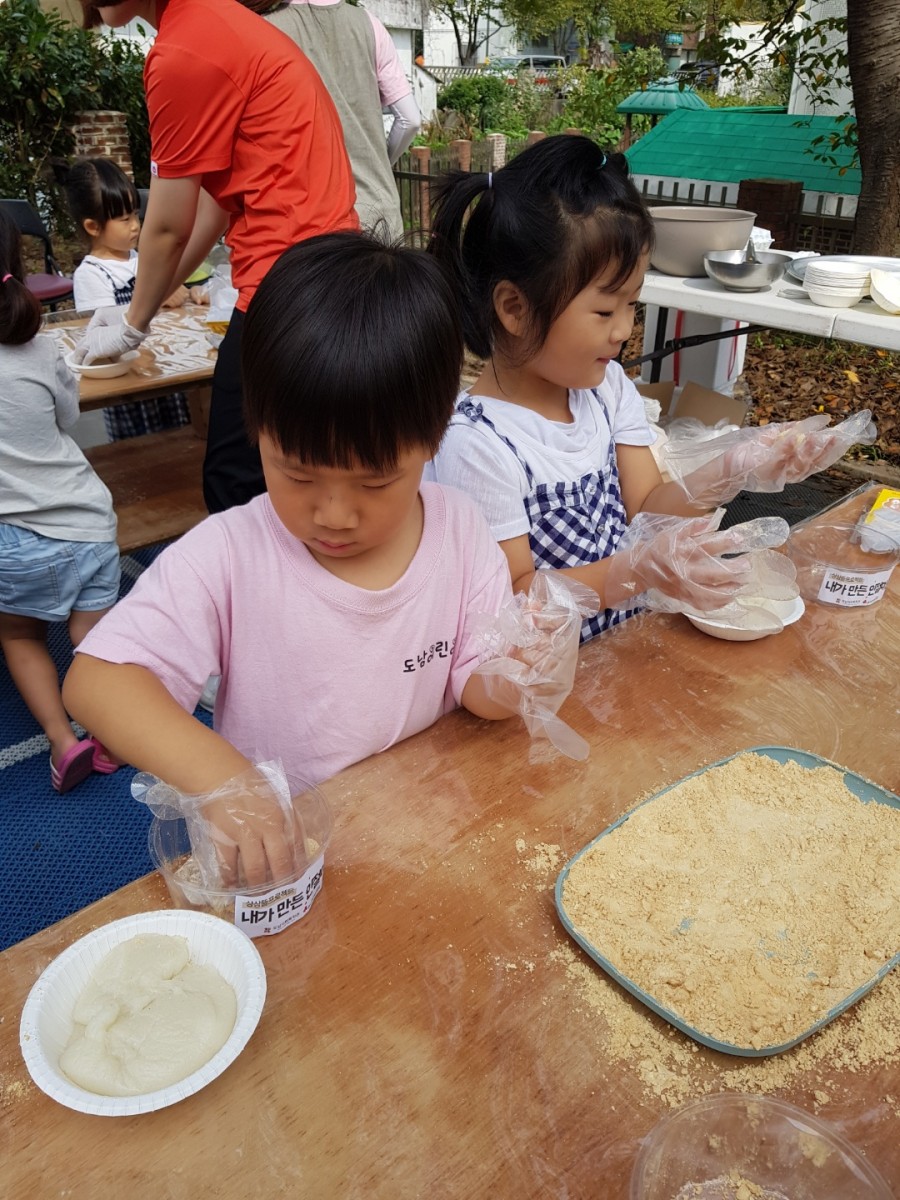 상상뜰 프로젝트 참여기관인 다솜, 도남, 미수주공어린이집 원아들이 지난 9월 19일(수)에 방문하여 상상뜰 프로젝트 1차 나눔장터 '민속놀이체험, 떡만들기 체험 등'을 참여하였습니다.