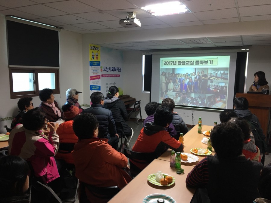 도남사회복지관 배은영 관장님과 한글강사 선생님의 인사말 이후, 사진을 통해 2017년 사업 돌아보기가 진행되어 이전에 재미있게 했던 프로그램들에 대해 회상할 수 있는 시간이 되었습니다. 그리고 2017년 성인문해교육지원사업 개강식 당시 한글교실을 시작하면서 나의 한마디라는 주제로 자신의 다짐 또는 하고 싶은 말을 적어 기록하였는데, 한글공부에 대한 애정과 감사 그리고 지쳤던 자신에게 희망의 메세지를 주는 따뜻한 시간이 되었습니다.