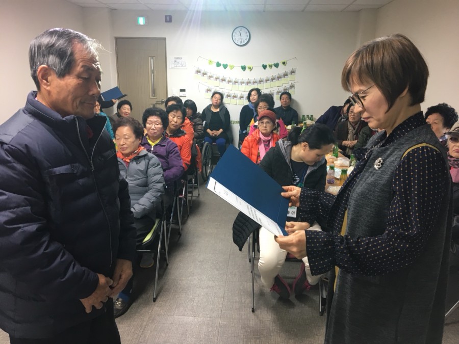 영상관람이 끝나고 난 후, 2017년 성인문해교육지원사업 수료식 및 시화전에 참여하신 이용자분들에게 상장수여하는 시간을 가져 한 해 동안 한글공부를 위해 매일같이 달려오신 학습자분들에게 격려와 축하의 시간이 되었습니다.