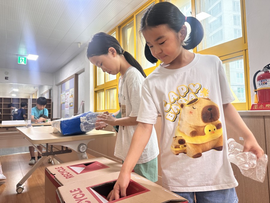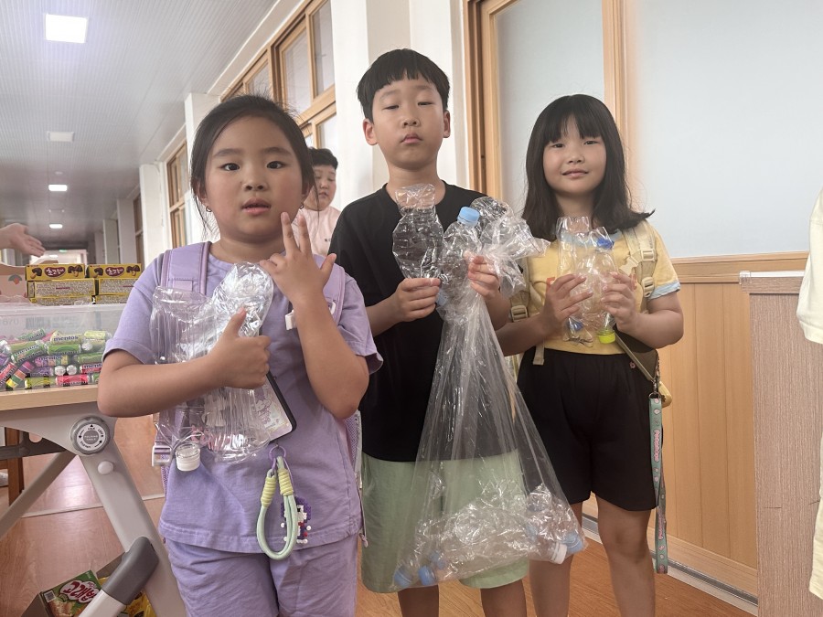 유영초등학교 전교생이 참여해 투명 음료 페트병을 모아오면