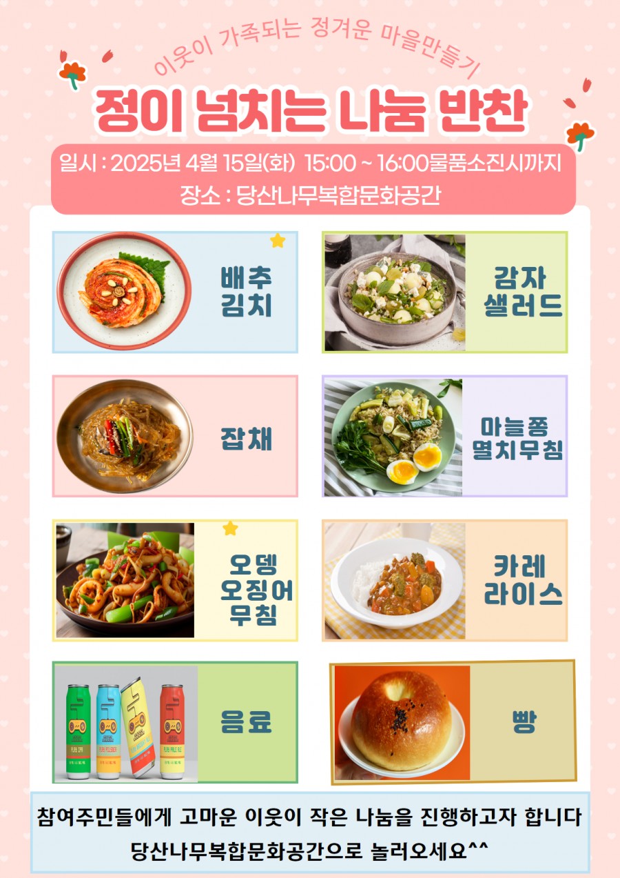 참좋은 동행점에서 후원해 주신 다양한 먹거리를 참여주민에게 나눔 행사를 당산나무복합문화공간에서 진행하고자 합니다. 바자회, 차나눔, 정신건강상담도 함께 진행하니 많이 많이 홍보해 주세요^^