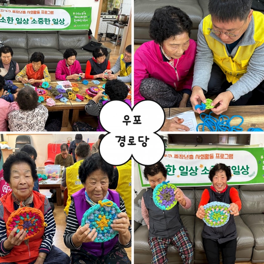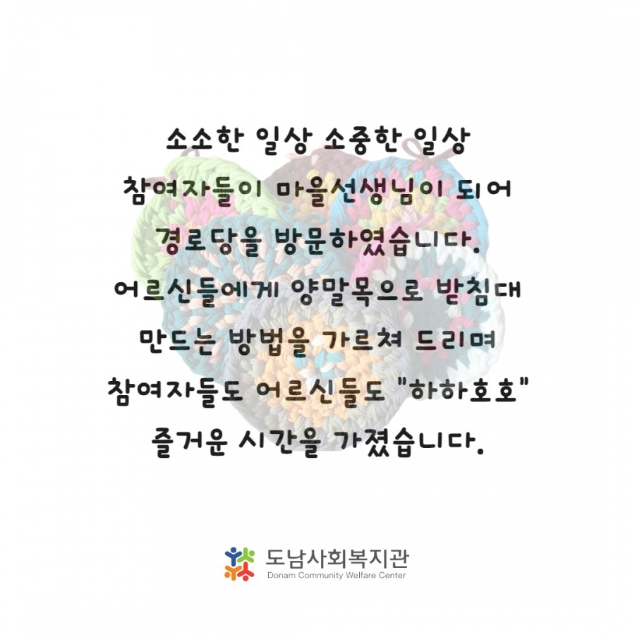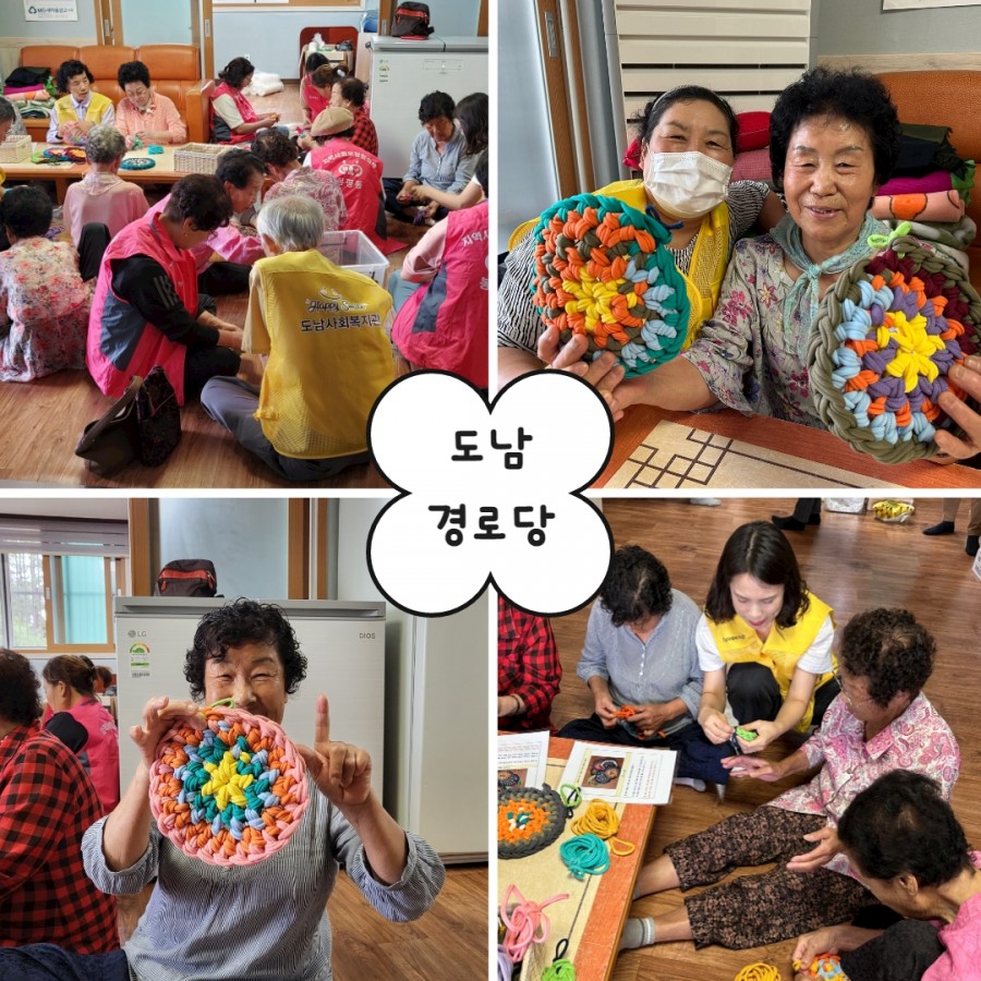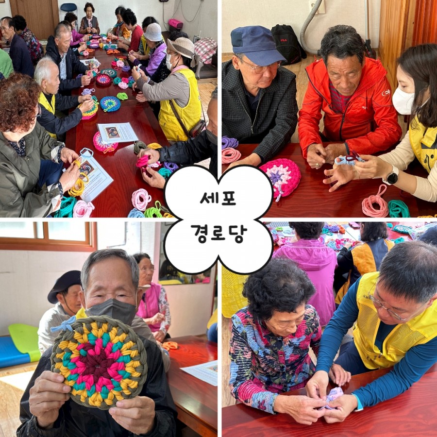 어르신들에게 양말목으로 냄비받침대 만드는 방법을