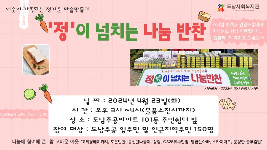 정이 넘치는 나눔 반찬 행사를 4월 23일에 진행하고자 합니다.