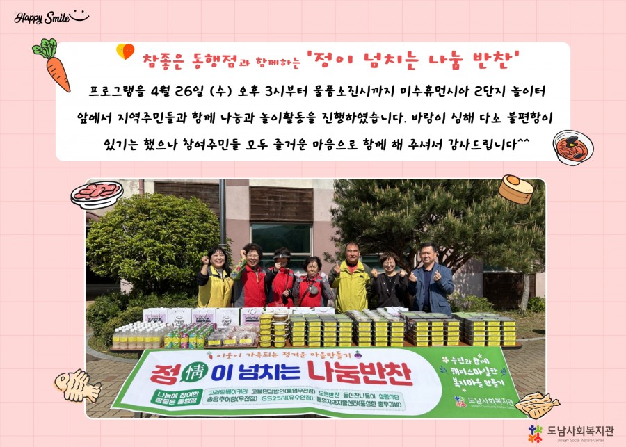 4월 26일(수) 15:00~물품소진시까지 참좋은 동행점과 함께하는 정이 넘치는 나눔 반찬을 진행하였습니다.^^