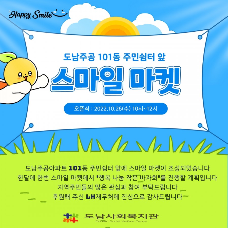 오는 10월 26일 (수) 10시 ~ 12시 에 도남주공아파트 101동 주민쉼터 앞 스마일 마켓 오픈식및 행복나눔작은 바자회를 진행하고자 합니다. 지역주민들의 많은 관심과 참여 부탁드립니다.^^