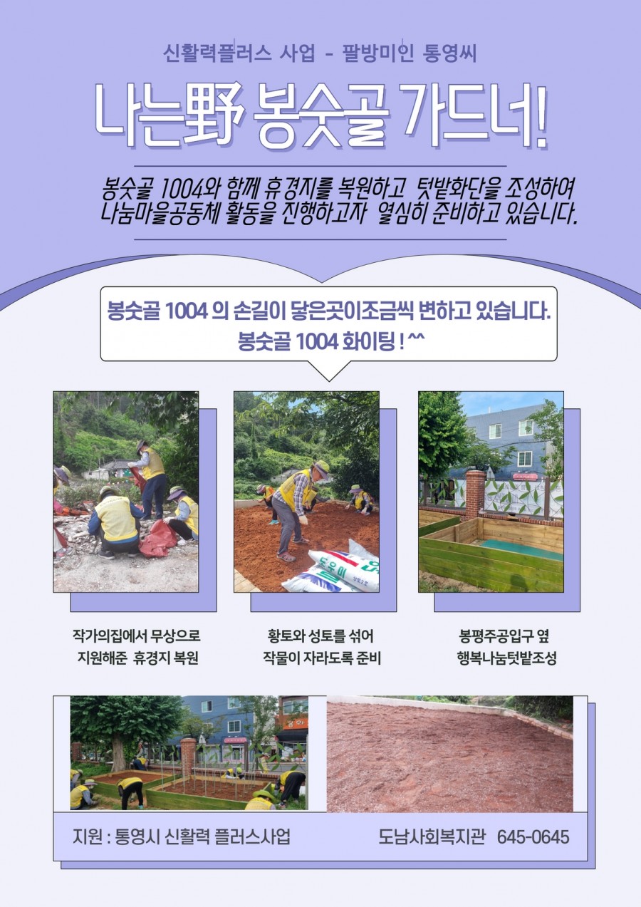 봉숫골 1004와 함께 작가의 집에서 무상으로 임대해준 휴경지와 봉평주공아파트 입구에 행복나눔텃밭을 복원하고 조성하여 작물을 심고 수확하여 나눔마을공동체 활동을 준비중에 있습니다. 작물들이 건강하게 잘 자라도록 정성껏 가꾸고 있는 중입니다.^^