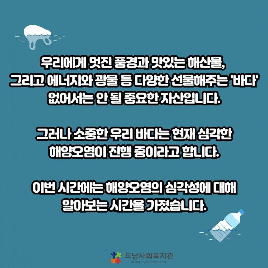 우리의 소중한 자산인 바다가 쓰레기로 인해 힘들어하고 있다고 해요.
