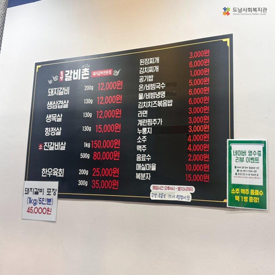 돼지갈비를 비롯해 생삼겹살, 생목살, 육회 등 다양한 메뉴를 즐길 수 있는 곳입니다.